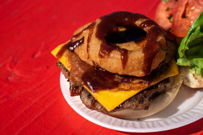 ½ lb burger w/American cheese, bacon & BBQ sauce. Topped w/onion rings