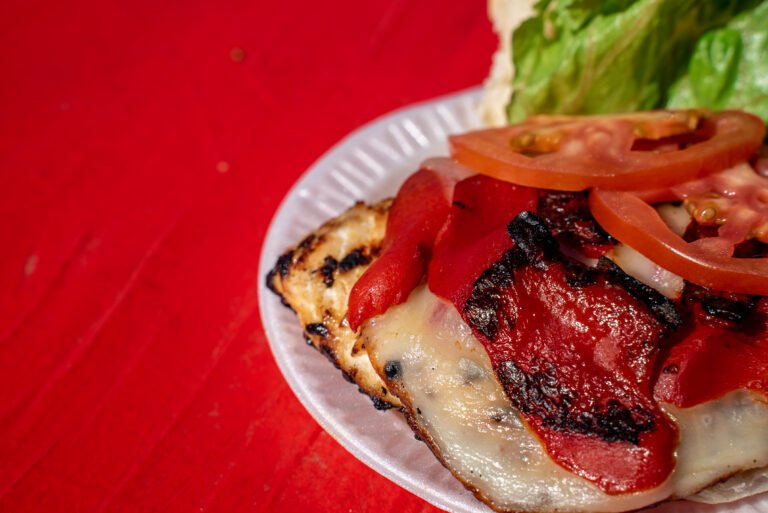 ½ lb burger w/provolone cheese, ¼ lb grilled bologna steak w/peppers, onions & hot sauce